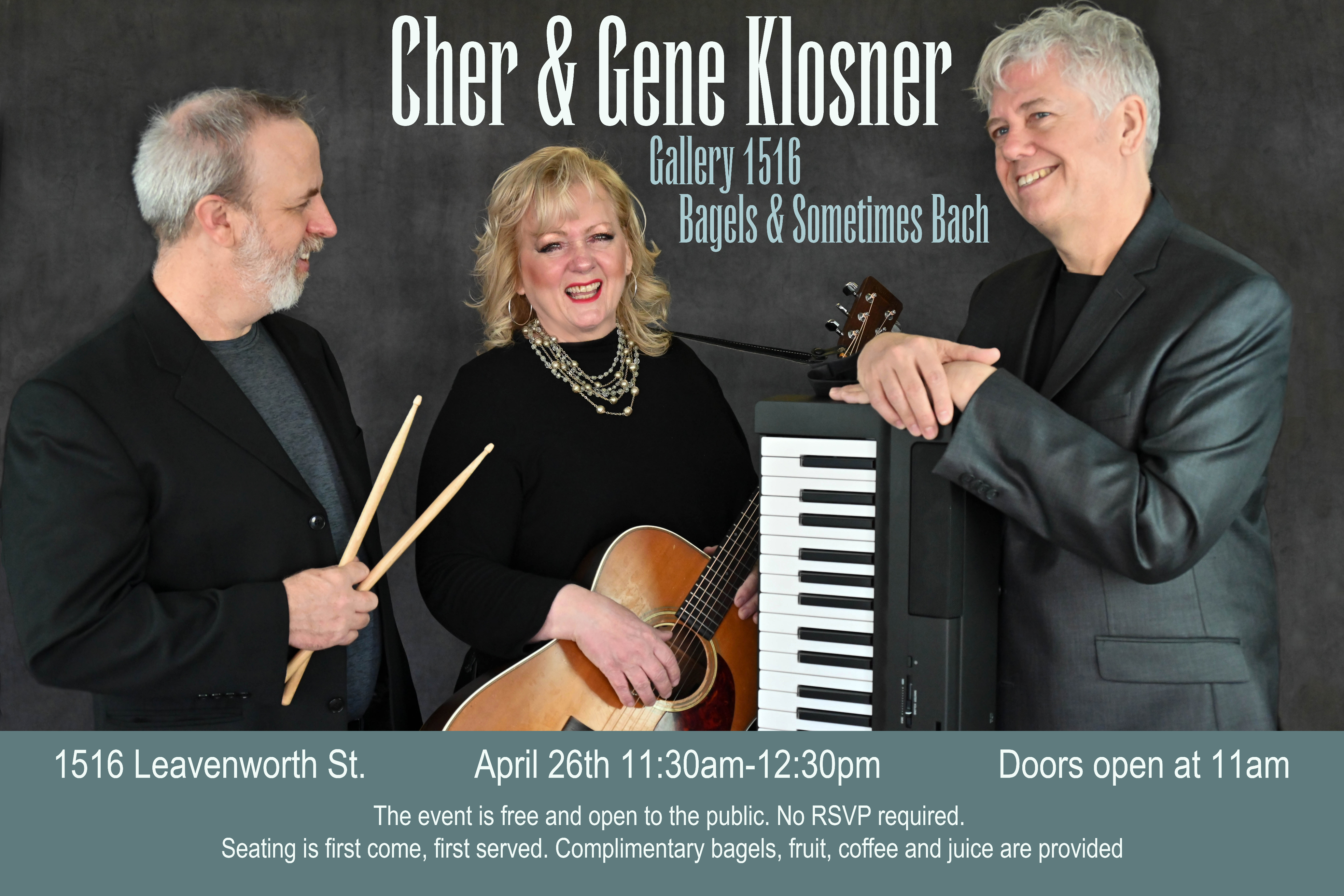 Cher & Gene Klosner Trio return to Gallery 1516 for their "Bagels & Sometimes Bach" Sunday Morning Concert Series, April 26 11:30am - 12:pm. Doors open at 11:00am. Event is free and open to the public. No reservations required, but get there early as it is first come first served. CDs and Merchandise will be available for purchase after the performance.